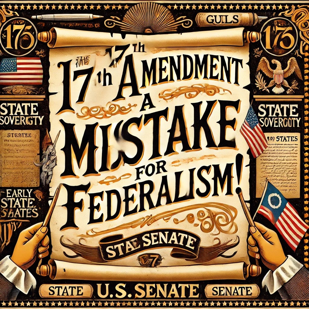 When the Founding Fathers crafted the Constitution, they intended for the U.S. Senate to be a voice for the “states” in federal government. After all, the original idea was to have balanced control between the states and the federal government, right? But in 1913, the 17th Amendment flipped the script. It replaced state legislatures electing the “State Senators” with direct election of senators by “We the People”. Sounds democratic, right? Yes it does, until you realize this move gutted the states' influence in Washington and shifted the balance of power in ways we’re still fighting today.
